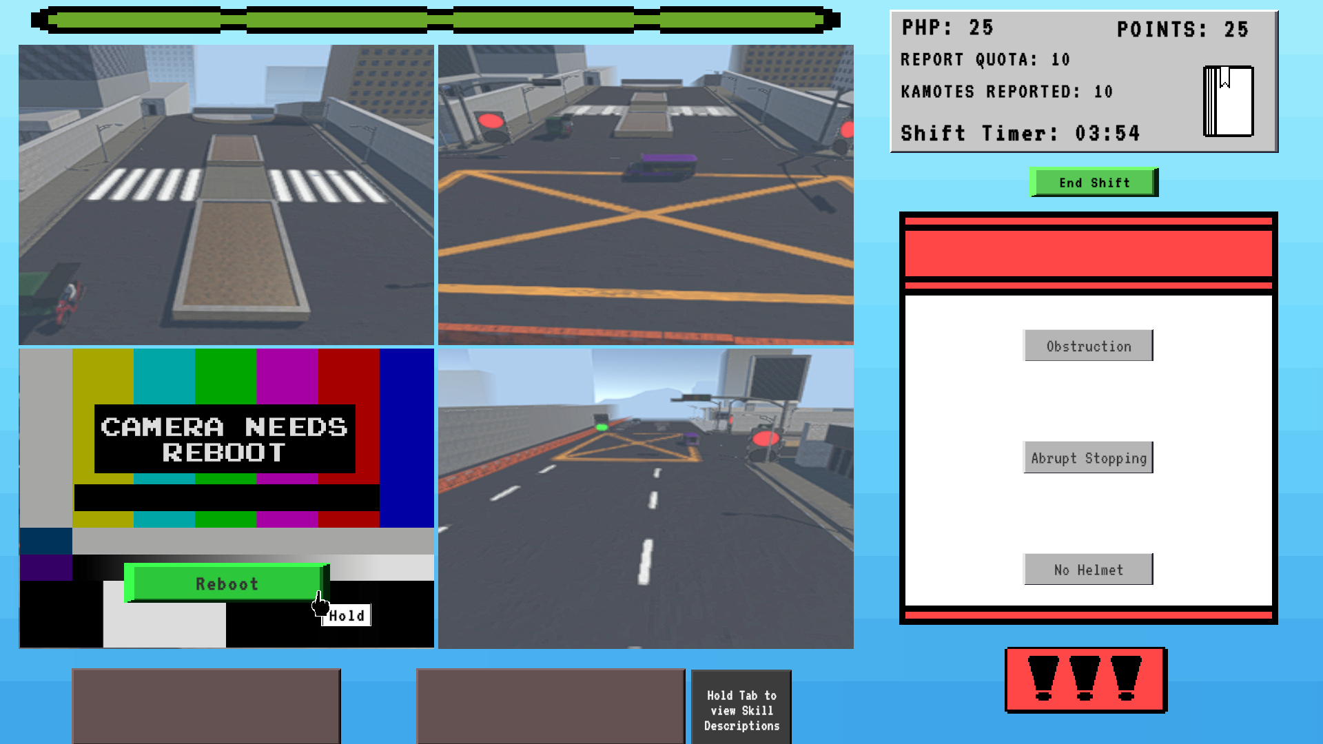 Hurry! A catastrophe is upon us, a Kamote catastrophe! We need you to play as a traffic enforcer, but don’t worry, you won’t be under the scorching sun. You will work directly in our headquarters, equipped with great technology to report any traffic violations you see through the eyes of our traffic cameras. Highlight them, report the infraction they committed, and send them a financial setback. Keep your eyes peeled for there is no rest for the Kamote’s, you wouldn’t want any accidents in the city now would you? Right, same for us, so do your best in catching every, single, one, goodluck.